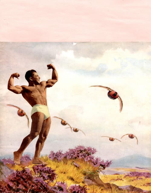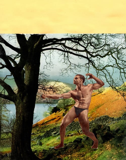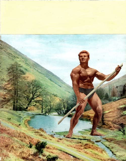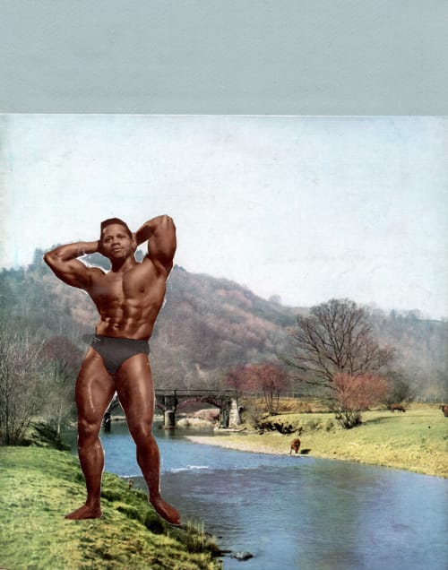 "The images began with finding a stack of old 1950s magazines in a great second-hand book stall in Pontypridd Market and combining a new interest in the representation of landscape with an old interest in the male body. Old-school body building relooked at, with some surprising discoveries."